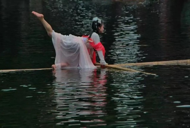 看,一艘舟舫缓缓靠岸,仿佛是从历史长河中悠悠驶来。船上美人舞姿曼妙,船行景移间宛如开启“舟中观史,舫外入画”的时空之旅;