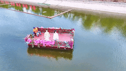 看,六条花船河上巡游,乐手歌者的弦音雅乐,丝丝入耳,于一方潋滟水波之上书写着“水韵江南”与“杨柳风情”的对话;