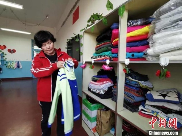 吾吉整理捐赠的衣物。 张晓敏 摄