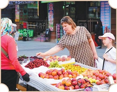 俄罗斯游客在满洲里街头购物。 王化勇摄