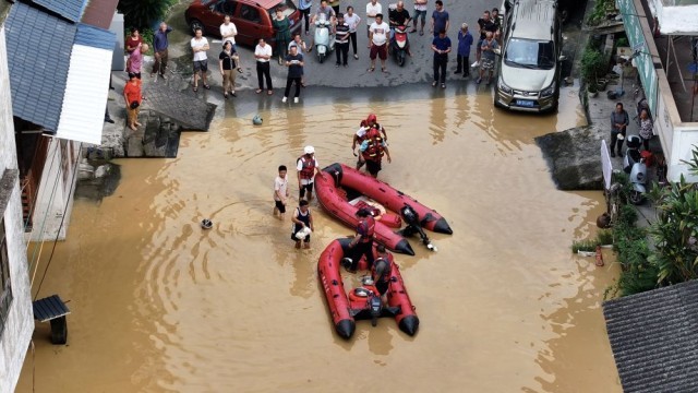 6月25日,广西融安县城部分街道被淹,救援人员用皮划艇帮助群众出行。(无人机照片)