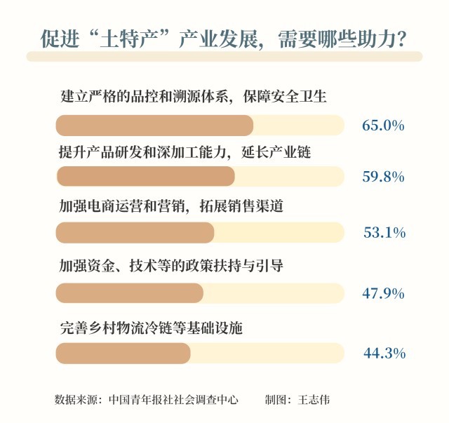 近日,中国青年报社社会调查中心联合问卷网(wenjuan.com)对1506名受访者进行的一项调查显示,83.3%的受访者期待越来越多“土特产”成为当地的重要名片。促进“土特产”产业发展,65.0%的受访者希望建立严格的品控和溯源体系,保障安全卫生,59.8%的受访者建议提升产品研发和深加工能力,延长产业链。