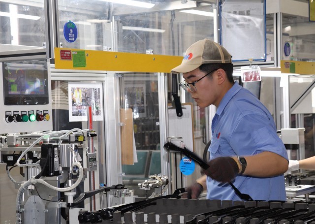 安徽胜华波汽车电器有限公司雨刮器生产线,青年产业工人正在作业。中青报·中青网记者 宋莉/摄