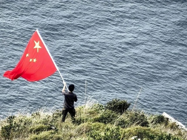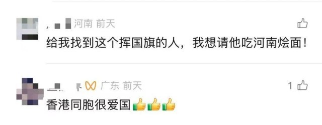 阿兵挥舞国旗,迎接山东舰航母编队访港。