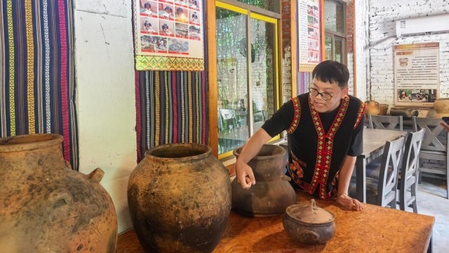 在保突制陶馆,李名众正介绍黎族原始制陶技艺。中青报·中青网见习记者 戴瑶/摄