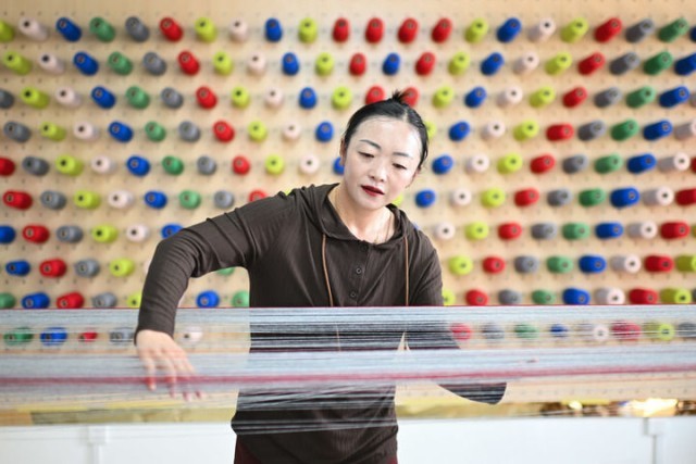 在青海省果洛藏族自治州玛沁县久美家园的“沪沁怡”氆氇手工编织坊内,工作人员卓玛杰在梳经,该工坊由上海援青团队打造(2024年7月19日摄)。