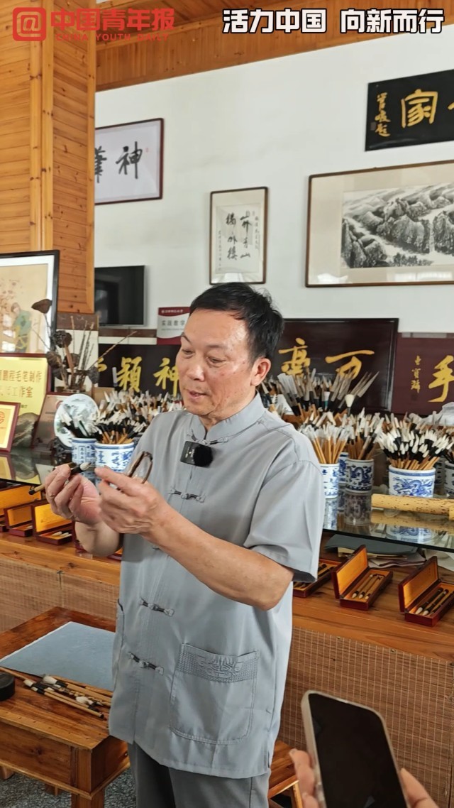 1998年出生的徐逸篪是全国轻工技术能手、毛笔制作市级非遗传承人。他说,配料工艺需要学一辈子,不同的毛料搭配会有不同的效果。学艺十多年,他将毛笔比作人,“毛笔最重要的是力(的保证)”,每支毛笔的核心力量都要保证足够足,“笔锋才不会散”。(中青报·中青网记者 朱彩云 刘静)