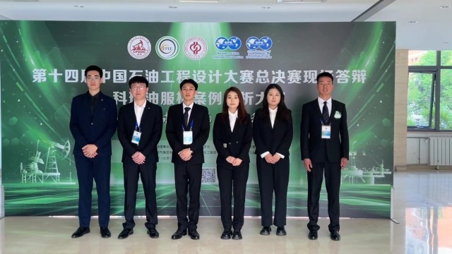 马松琛(左一)及其团队成员和学校参赛者参加第十四届中国石油工程设计大赛总决赛。受访者供图