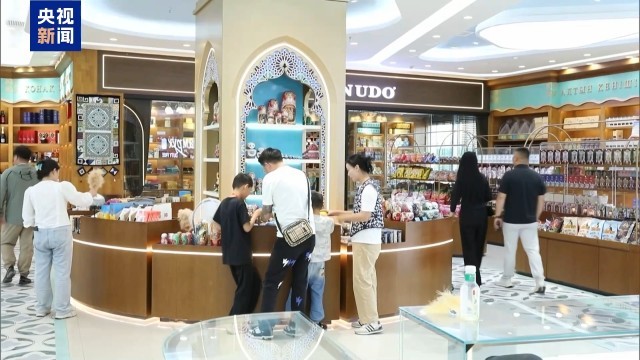 中哈霍尔果斯国际边境合作中心商户 林梓轩:现在是旅游旺季,每天有大量的国内外游客来店里采购我们的免税商品。我们店单日营业额最高一天可达10万元。