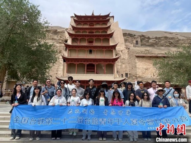 7月9日,全国台联第二十二届台胞青年千人夏令营甘肃分营营员在敦煌莫高窟合影。 申志波 摄