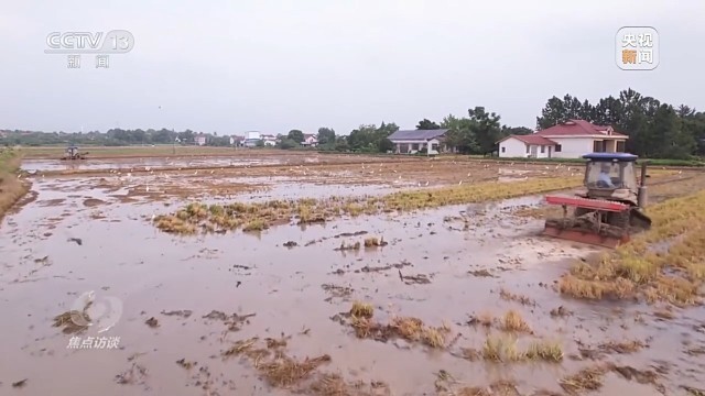 7月12日清早,湖南常德鼎城区镇德桥镇,一边稻田正在收割早稻,平整土地,另一边稻田插秧机正在移栽晚稻秧苗,机器轰鸣,白鹭盘旋。
