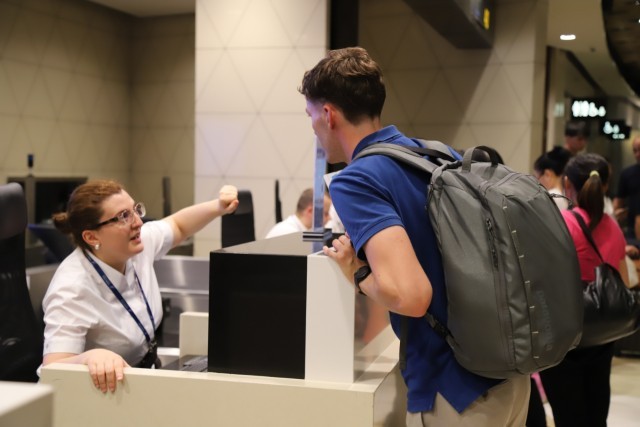 当地时间7月15日晚,巴库,盖达尔·阿利耶夫国际机场工作人员为外籍旅客解答免签政策。中青报·中青网驻南高加索记者 张健/摄