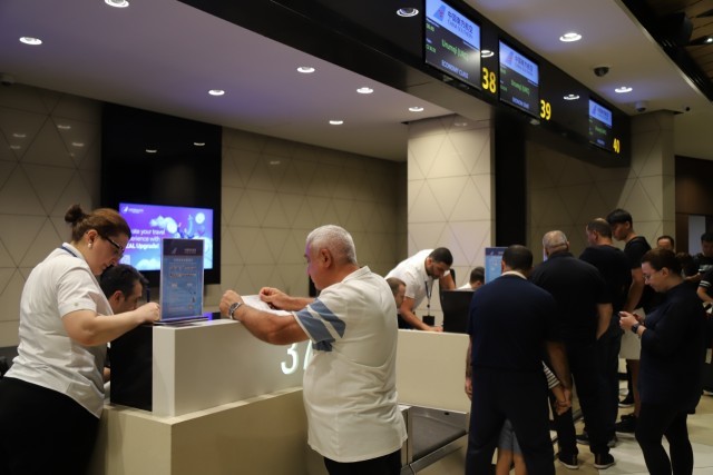 7月15日晚,巴库,阿塞拜疆公民在盖达尔·阿利耶夫国际机场南方航空柜台办理值机赴华。中青报·中青网驻南高加索记者 张健/摄