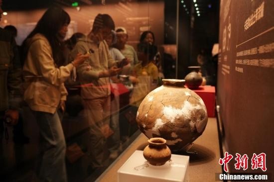 7月15日,在位于西藏拉萨的西藏博物馆,卡若遗址出土的陶器吸引观众。