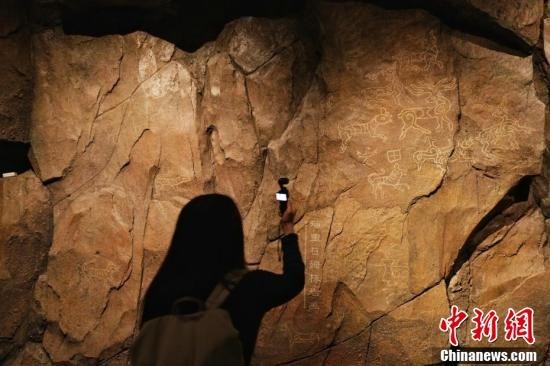 7月15日,在位于西藏拉萨的西藏博物馆,观众拍摄复原的阿里日姆栋岩画。