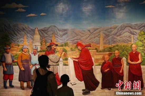 7月15日,在位于西藏拉萨的西藏博物馆,观众参观“凉州会谈”场景,“凉州会谈”结束了吐蕃地方政权对西藏的长期分治局面,顺应了国家统一的历史潮流。