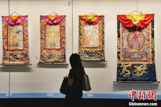 7月15日,在位于西藏拉萨的西藏博物馆,观众品鉴唐卡艺术。