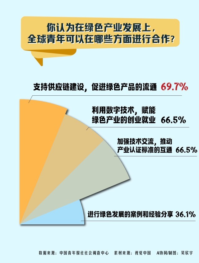 在2025年世界青年发展论坛开幕前,中国青年报社社会调查中心联合问卷网(wenjuan.com),对1506名青年进行的一项调查显示,82.5%的受访青年平时会关注与绿色发展有关的国际合作,88.4%的受访青年期待在绿色产业上与全球青年有更多合作,69.7%的受访青年期待在供应链建设上加强合作,促进绿色产品流通。