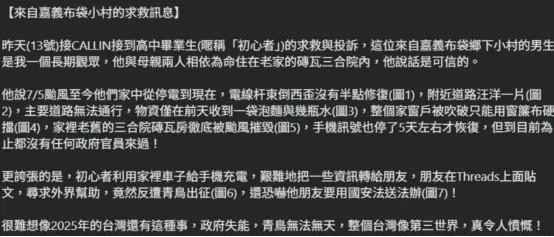 台湾网民评嘉义高中生灾后求助遭“青鸟”出征:当局失能,“青鸟”无法无天,令人愤慨。图源:社交媒体