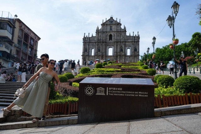 2025年7月9日,游客在澳门大三巴牌坊前游览。新华社发(张金加 摄)