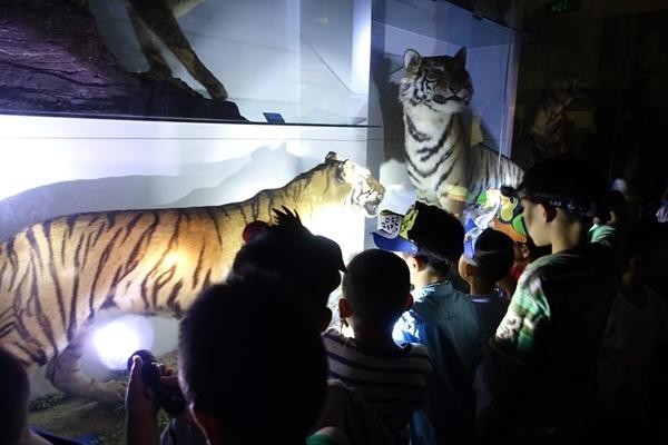 孩子们在国家动物博物馆熄灯环境里用手电筒照明,观察孟加拉虎和东北虎标本。受访者供图