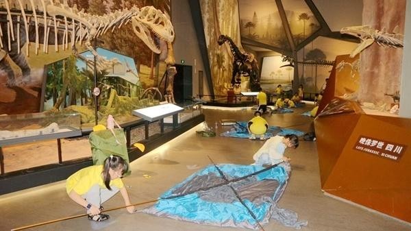 夜宿活动参与者在浙江自然博物院恐龙馆中搭建帐篷。 受访者供图