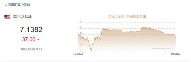 8月8日人民币对美元中间价报7.1382元 下调37个基点
