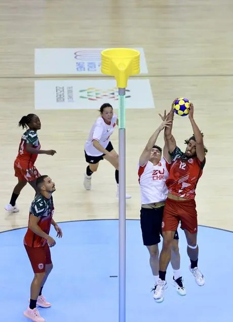 8月9日,2025成都世运会荷球混合团体赛预赛,中国队(白)对葡萄牙队。视觉中国供图