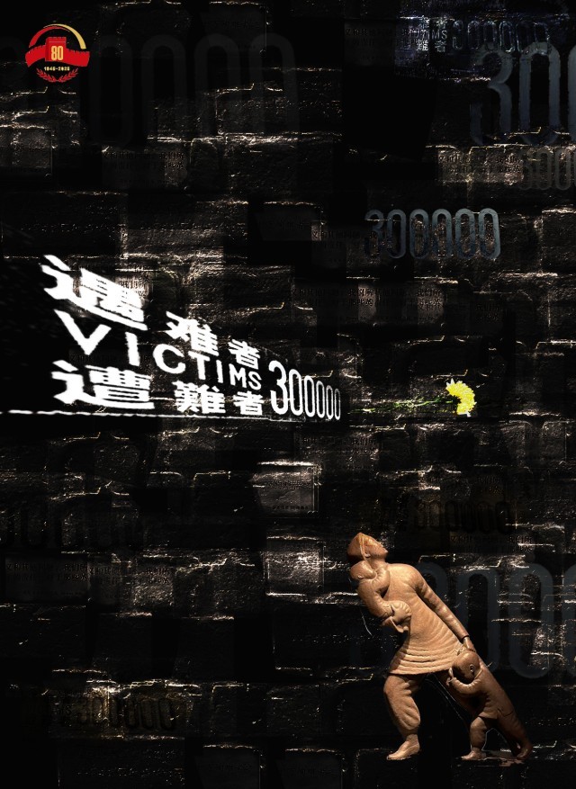 在侵华日军南京大屠杀遇难同胞纪念馆“南京大屠杀史实展”第一部分,《轰炸》雕塑在此静静伫立:年轻的母亲仰头回望天空中的敌机,右手紧搂着怀中的婴儿,左手拉着几岁的幼子,在惊惶中奔走。雕塑中,母子三人的身体以45度前倾,形成极不稳定的三角形,母亲绷直的脊梁与孩童蜷缩的身体,构成了强烈对比,大大强化了作品的视觉张力。
