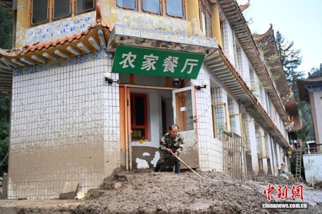 8月11日,与兴隆山标志性建筑卧桥“守望”30多载的“农家餐厅”老板高伟元正在清理室内淤泥。九美旦增 摄