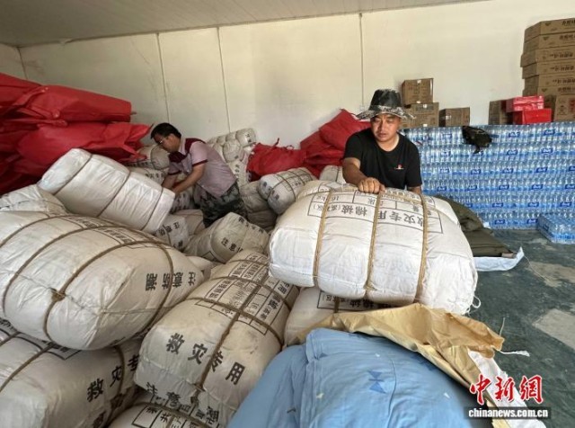 8月11日下午,榆中县马坡乡上庄村党支部书记、村委会主任陈万凯(右)和村民分拣山外送来的救灾物资。冯志军 摄