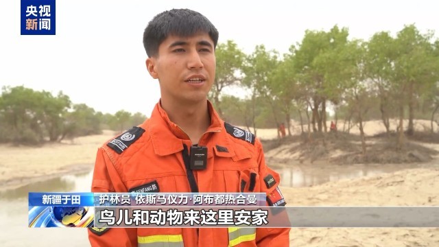 护林员 依斯马仪力·阿布都热合曼:我们每天都在林子里巡查,看着洪水慢慢滋润着胡杨林,心里特别踏实。播撒种子也是为了能让这片林子更茂盛,以后会有更多的鸟儿和动物来这里安家。