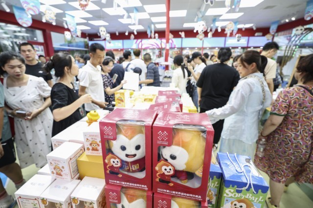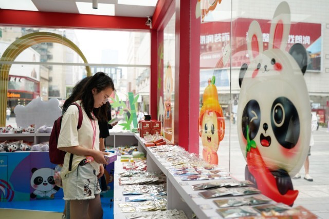 ↑8月7日,顾客在成都一家世运会官方特许商品零售店选购。新华社记者 张丽芸 摄