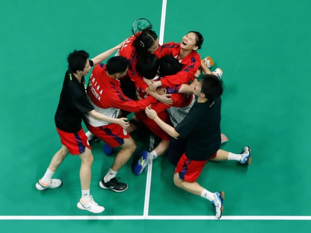 ↑2024年5月5日,中国队庆祝夺得2024年尤伯杯冠军。新华社记者贾浩成摄