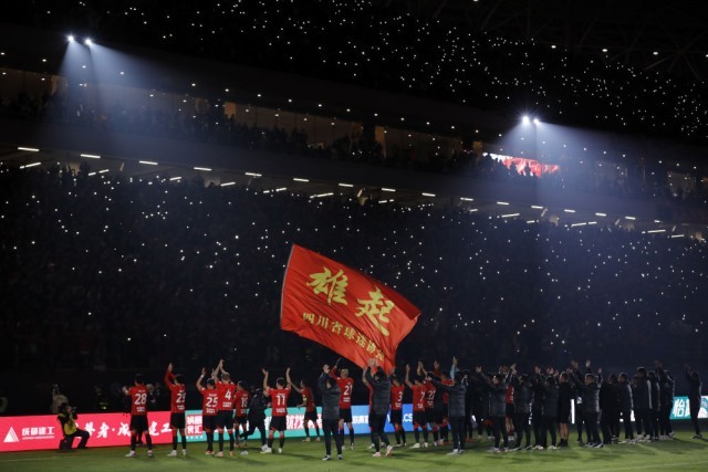 ↑2024年3月2日,成都蓉城队球员在中超比赛后与现场球迷互动。新华社记者沈伯韩摄