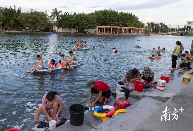 6月22日,汕头潮阳区铜盂镇,傍晚的练江支流边,妇女们在洗衣物,孩子则在水中玩耍。