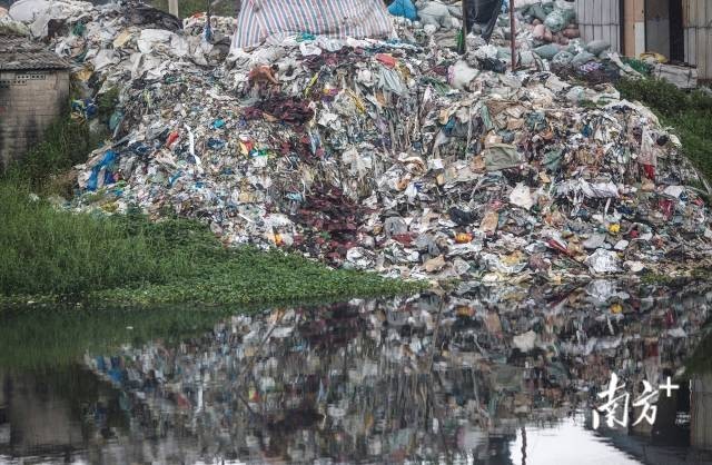 2015年,揭阳普宁市占陇镇,居民在河边的垃圾山上倾倒垃圾。