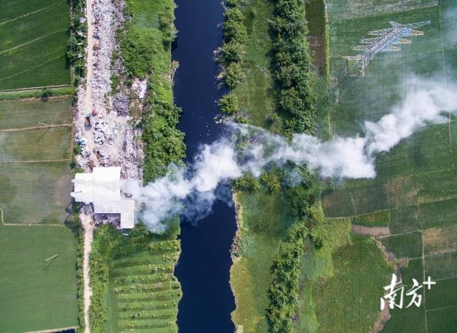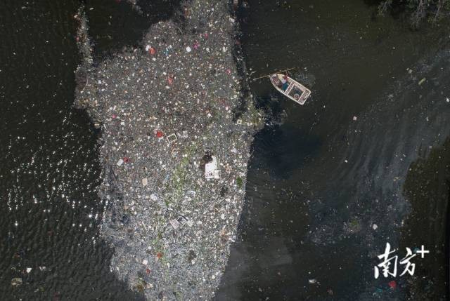 2018年,汕头潮阳区贵屿镇,工作人员正在清理练江支流上的垃圾。