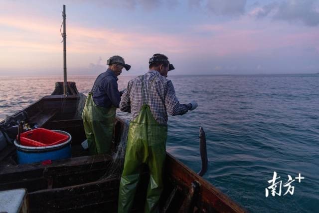 漆黑的夜色中,小船向着大海驶去,只听见马达的响声。船上已是忙碌景象,53岁的哥哥杨英烈船尾掌舵,经验丰富的他不需要看定位仪,就能把船开到鱼群最多的礁石群上方,49岁的弟弟杨举波戴着头灯正在切鱼饵,超叔则在船头整理放钓的鱼钩,年过七十的他双手比年轻人都灵活,处理数十个鱼钩游刃有余。