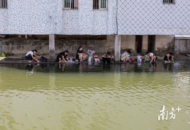 6月21日清晨,揭阳普宁下寨村的前溪,妇女们边聊天边洗衣物。