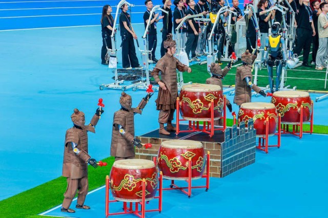 鼓声响起,9台人形机器人“光子”身披3D打印的秦俑战甲,与北京舞蹈学院舞蹈演员共同摆动双臂,跟着节奏起舞。在世界人形机器人运动会赛场一侧,这支机器人群舞节目刚开演,看台上多位观众就打开手机拍照,还有离比赛区域较远的观众索性掏出望远镜观看。