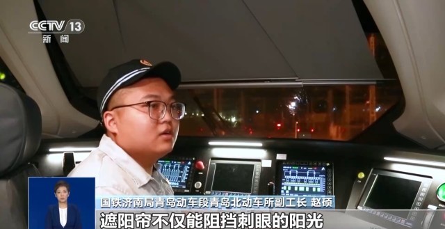 国铁济南局青岛动车段青岛北动车所副工长 赵硕:遮阳帘不仅能阻挡刺眼的阳光,还能避免驾驶舱内温度快速升高,减少仪表盘、操纵台设备等因长时间暴晒出现过热情况。