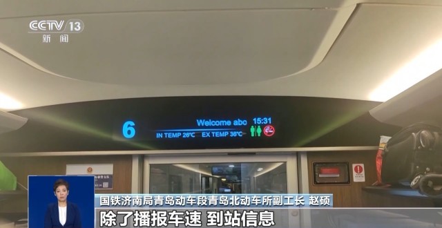 国铁济南局青岛动车段青岛北动车所副工长 赵硕:我们这个车窗用的是中空玻璃,中间充满惰性氩气的中空层能大幅减少热传导,隔热效果非常明显,再把遮阳帘一拉就能阻挡阳光直射。车厢里的显示屏除了播报车速到站信息,还能实时播报车内外温度。