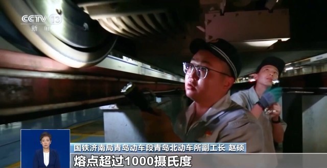 国铁济南局青岛动车段青岛北动车所副工长 赵硕:除了地面温度高,高速运转的车轮和轨道之间摩擦也会产生热能。车轮采用的是最高强度的特种钢材,熔点超过1000℃,安全性和可靠性都很强,完全不用担心“烫脚”。