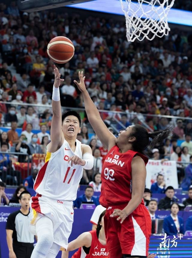 2023年杭州亚运会,中国女篮力压日本女篮夺得亚运会金牌。图为广东运动员黄思静在比赛中上篮。南方+记者 董天健 摄
