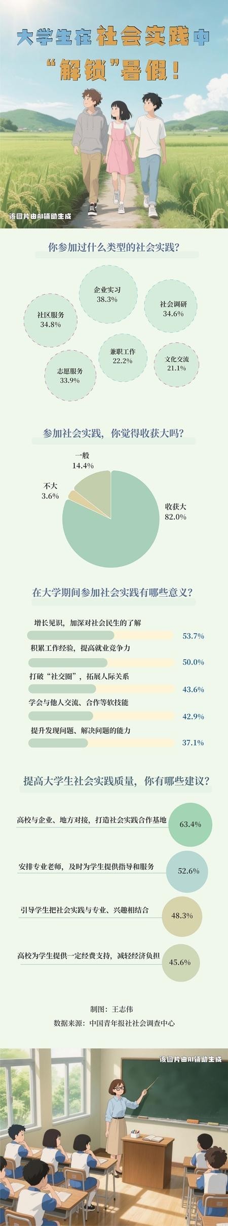 暑期,不少大学生选择走出家门,参与社会实践。中国青年报社社会调查中心的一项调查显示,87.8%的受访大学生认同更大的课堂在祖国大地上。提高大学生社会实践质量,63.4%的受访大学生希望高校与企业、地方对接,打造社会实践合作基地,52.6%的受访大学生希望安排专业老师,及时为学生提供指导和服务。