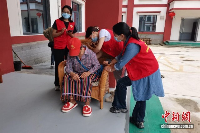 2025年5月23日,墨脱县政协办党支部党员干部与政协委员代表前往墨脱县一家养老院开展活动。图为黄小芳(右二)为行动不便老人按摩捶背。受访者供图