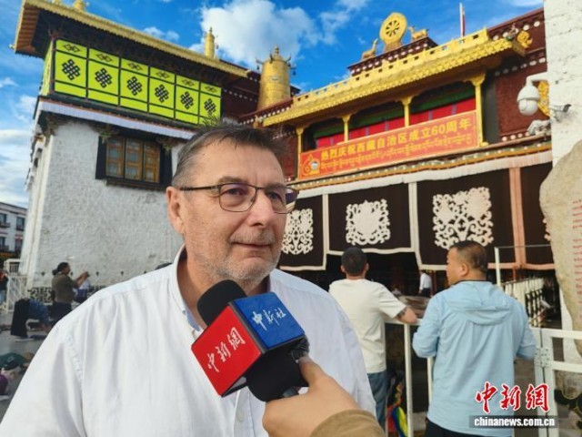 8月19日,法国游客Jean Francois在大昭寺前接受采访。中新社记者 杨程晨 摄