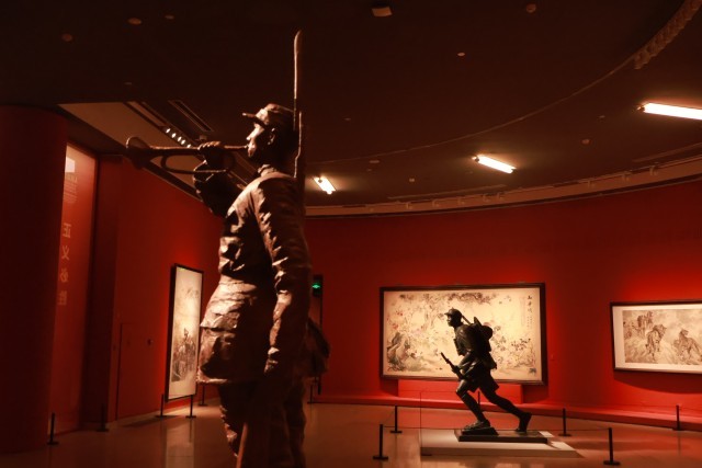 《无名英雄战士》与吴为山创作的雕塑《东进》。中青报·中青网见习记者 李怡蒙/摄