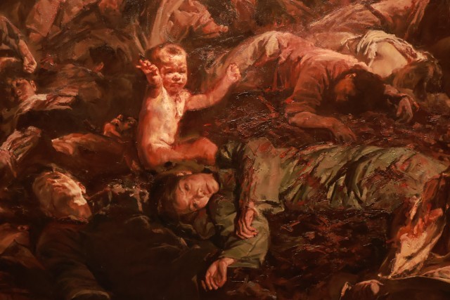 许江、孙景刚、崔小冬、邬大勇创作的《残日——一九三七年十二月·南京》油画局部。中青报·中青网见习记者 李怡蒙/摄